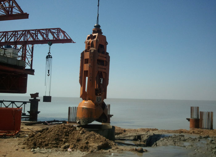 When the strata conditions are unstable, Casing is required to be driven to overall depth to prevent hole's collapse. It is called All Casing method (Benoto Method, Shaft Drilling). To drive the Casing and retract it after concreting, Casing Oscillator is strongly recommended to use. With its superior oscillating torque and lifting force, the machine shows the best performance of driving and retracting the casing. If it is used together with Hammer Grab, it shows the fast excavating speed with its big volume of jaw and it is available for excavating gravels and boulders layer.